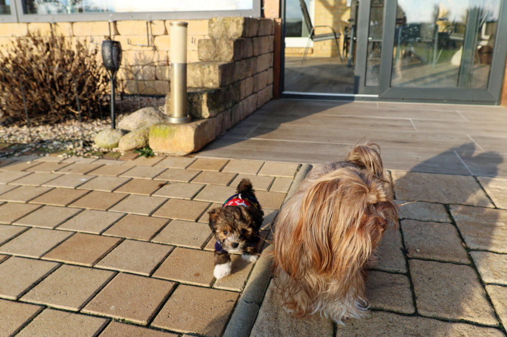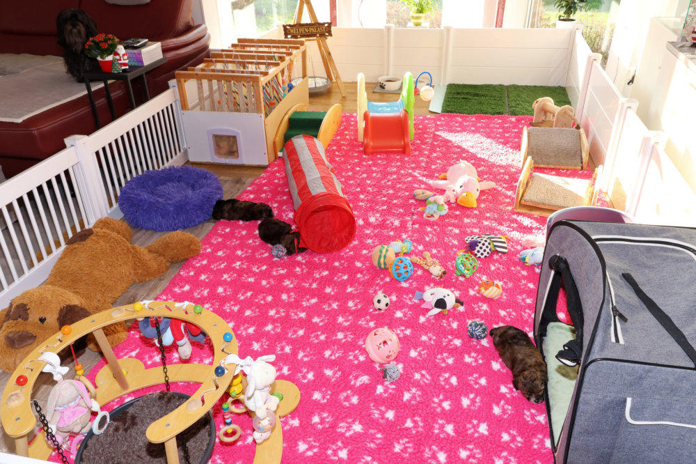 Als ich heute den Welpen-Auslauf gesäubert habe, konnten unsere Welpis ein wenig „Wohnzimmer-