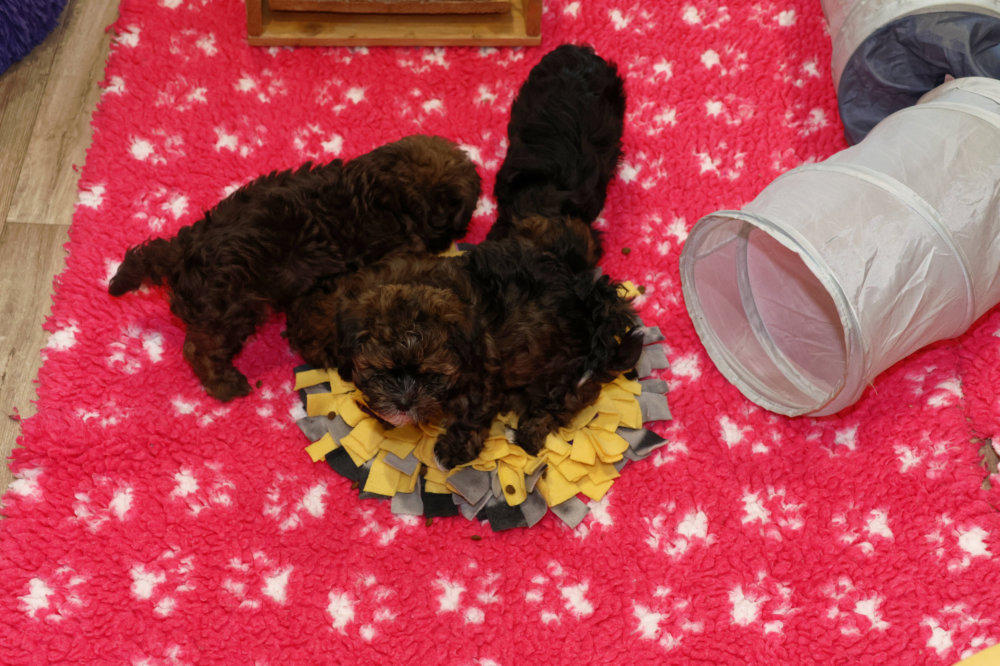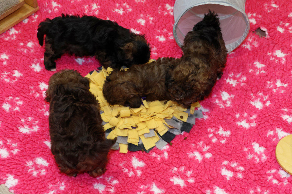 Die Schnüffelmatte kam zum Einsatz. Diese ist bei den Welpen immer sehr beliebt. Sie wird mit Lek-