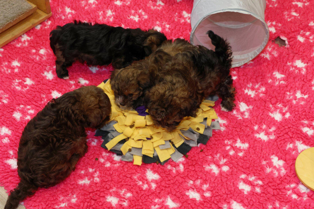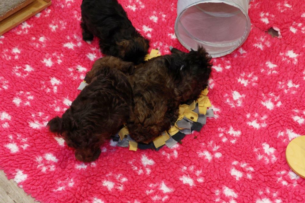 Die Schnüffelmatte kam zum Einsatz. Diese ist bei den Welpen immer sehr beliebt. Sie wird mit Lek-